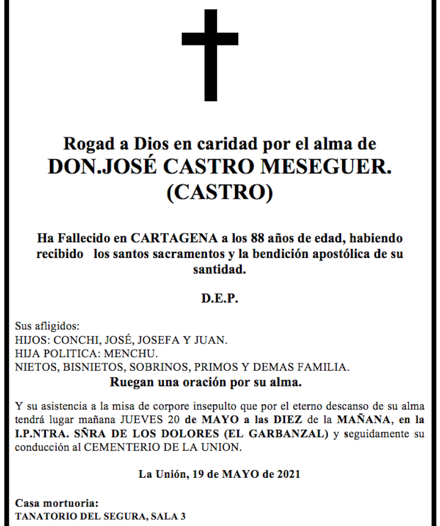 Sus afligidos hijos (Conchi, José, Josefa y Juan), hija política (Menchu), nietos, bisnietos, sobrinos, primos y demás familia ruegan una oración por su alma y su asistencia a la misa de corpore insepulto que por el eterno descanso de su alma tendrá lugar este jueves, 20 de mayo, a las diez de la mañana, en la iglesia parroquial de Nuestra Señora de Los Dolores (El Garbanzal) y seguidamente su conducción al cementerio de La Unión.
