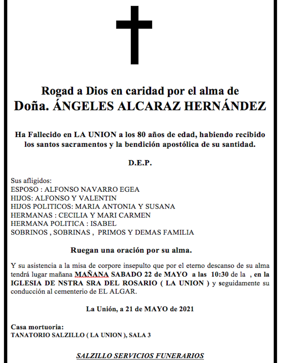 Sus afligidos esposo (Alfonso Navarro Egea), hijos (Alfonso y Valentín), hijos políticos (María Antonia y Susana), hermanas (Cecilia y Mari Carmen), hermana política (Isabel), sobrinos, sobrinas, primos y demás familia ruegan una oración por su alma y su asistencia a la misa de corpore insepulto que por el eterno descanso de su alma tendrá lugar mañana este sábado, 22 de mayo, a las 10:30 horas en la iglesia de Nuestra Señora del Rosario de La Unión, y seguidamente su conducción al cementerio de El Algar.
