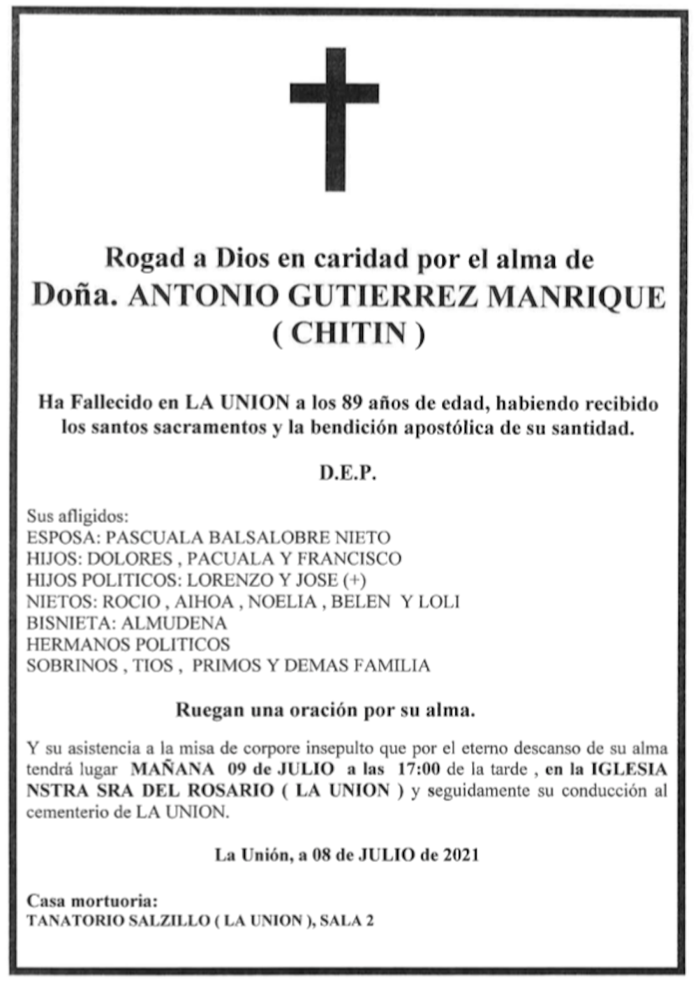 Ha fallecido en La Unión a los 89 de edad, habiendo recibido los santos sacramentos y la bendición apostólica de su santidad.
