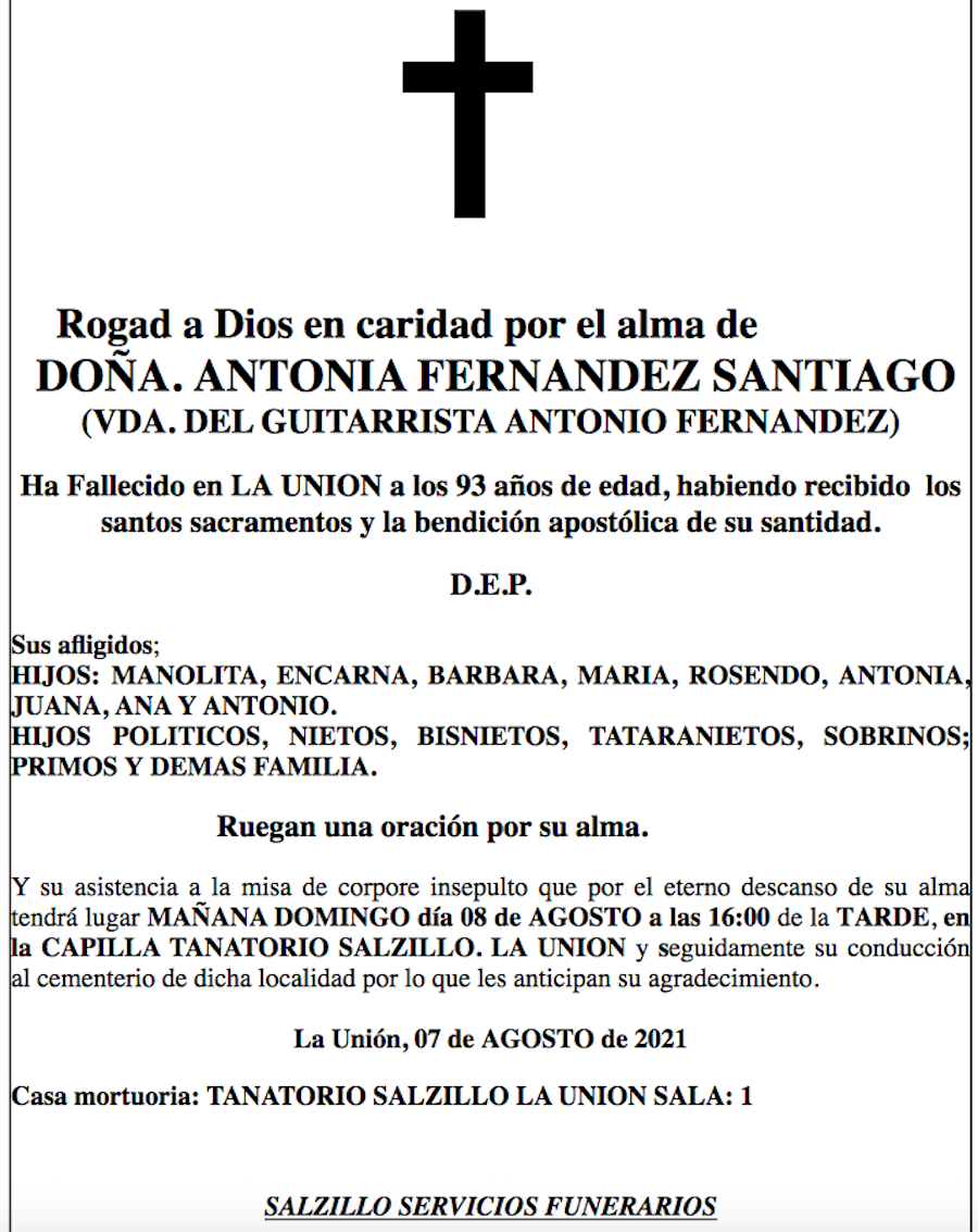 Sus afligidos hijos (Manolita, Encarna, Bárbara, María, Rosendo, Antonia, Juana, Ana y Antonio), hijos políticos, nietos, bisnietos, tataranietos, sobrinos, primos y demás familia ruegan una oración por su alma y su asistencia a la misa de corpore insepulto que por el eterno descanso de su alma tendrá lugar hoy, domingo 8 de agosto, a las 16 horas de la tarde, en la capilla Tanatorio Salzillo La Unión y seguidamente su conducción al cementerio de dicha localidad, por lo que les anticipan su agradecimiento.