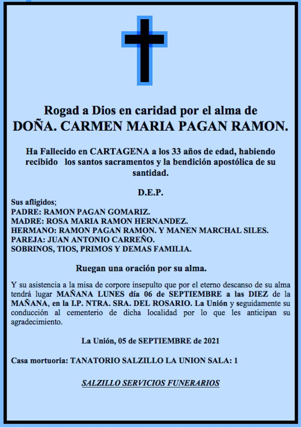 Sus afligidos padre (Ramón Pagán Gomariz), madre (Rosa María Ramón Hernández), hermanos (Ramón Pagán Ramón y Manen Marchal Siles), pareja (Juan Antonio Carreño), sobrinos, tíos, primos y demás familia ruegan una oración por su alma y su asistencia a la misa de corpore insepulto que por el eterno descanso de su alma tendrá lugar este lunes, 6 de septiembre, a las diez de la mañana, en la iglesia parroquial de Nuestra Señora del Rosario de La Unión, y seguidamente su conducción al cementerio de dicha localidad por lo que les anticipan su agradecimiento.