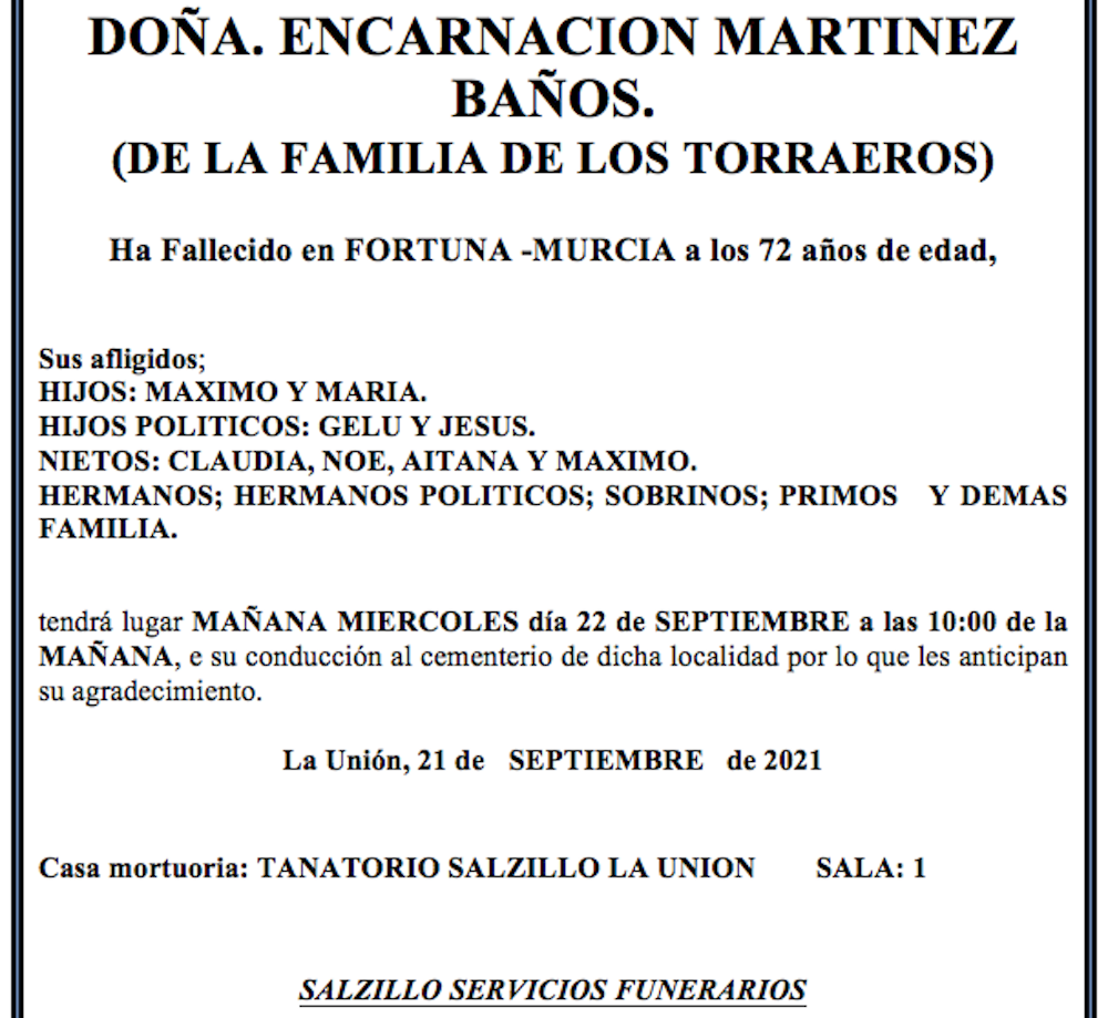 Su sepelio tendrá lugar este miércoles, 22 de septiembre, alas 10 de la mañana, con conducción al cementerio de La Unión, por lo que les anticipan su agradecimiento de las muestras de condolencias recibidas su familia:
