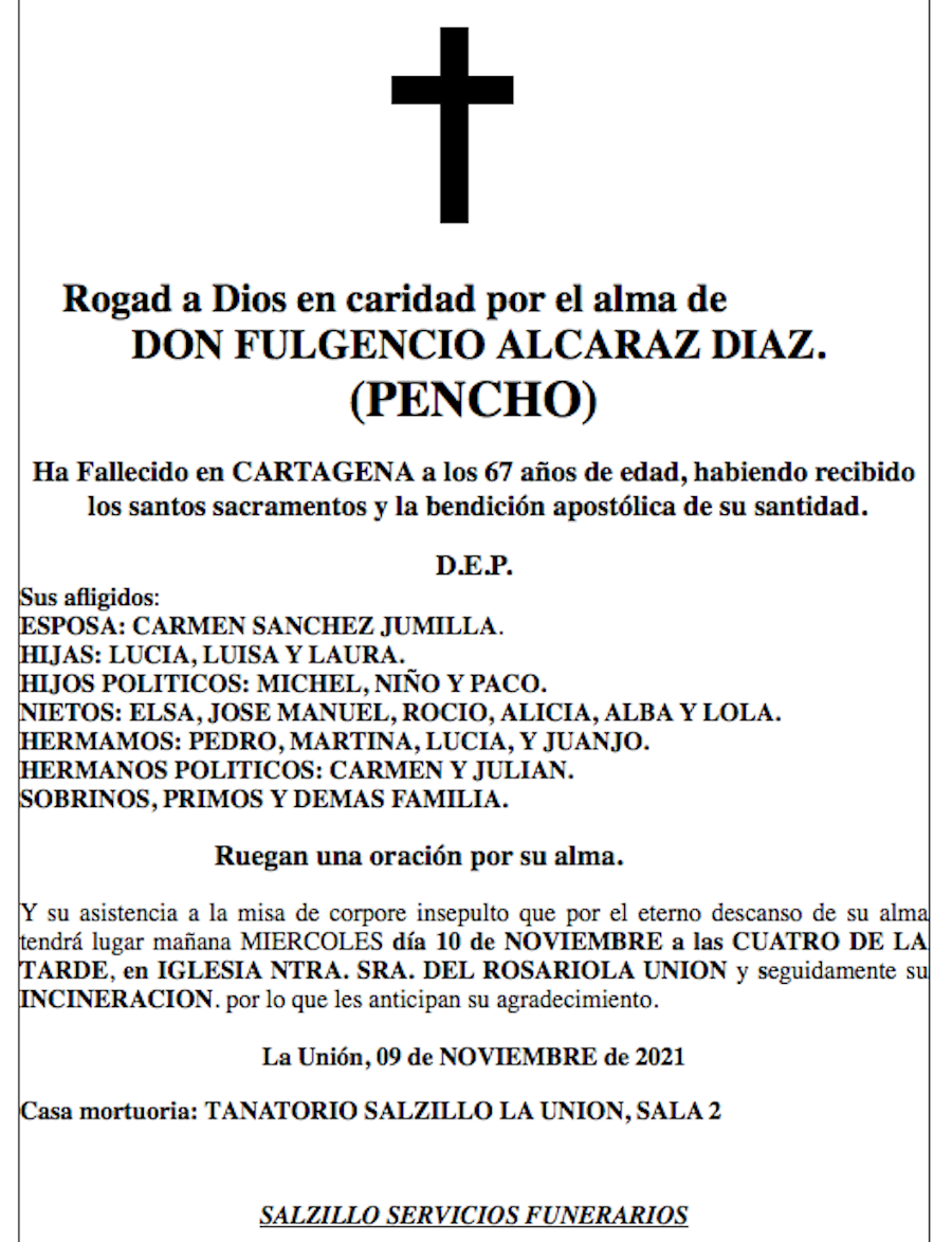 Sus afligidos esposa (Carmen Sánchez Jumilla), hijas (Lucía, Luisa y Laura), hijos políticos (Míchel, Niño y Paco), nietos (Elsa, José Manuel, Rocío, Alicia, Alba y Lola), hermanos (Pedro, Martina, Lucía y Juanjo), hermanos políticos (Carmen y Julián), sobrinos, primos y demás familia ruegan una oración por su alma y su asistencia a la misa de corpore insepulto que por el eterno descanso de su alma tendrá lugar este miércoles, día 10 de noviembre, a las cuatro de la tarde en la iglesia de Nuestra Señora del Rosario de La Unión y, seguidamente, su incineración, por lo que les anticipan su agradecimiento.