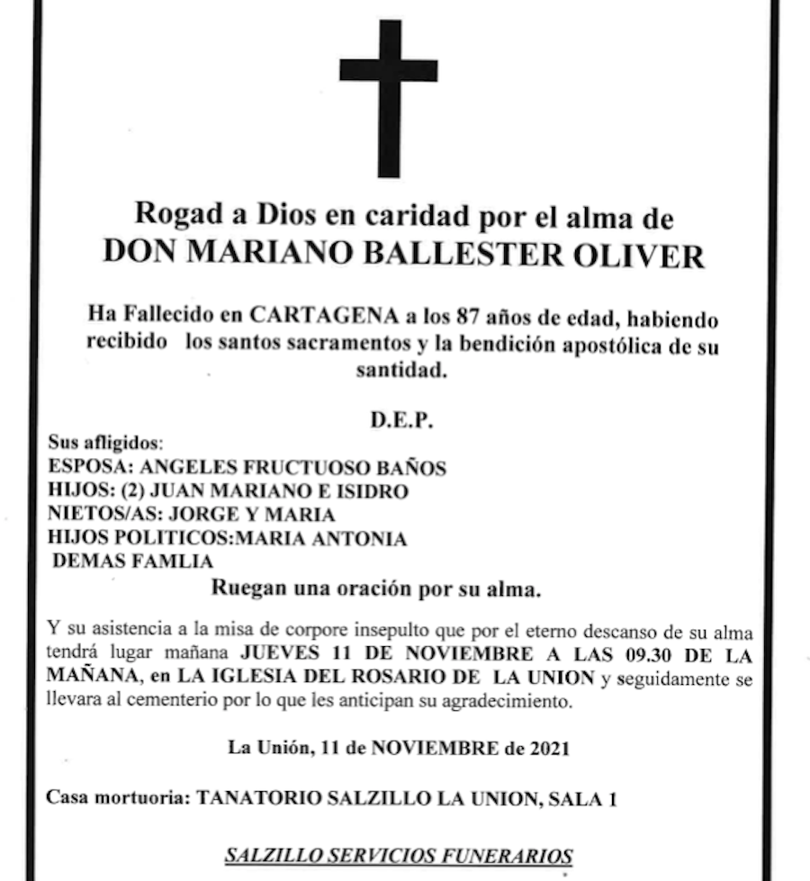 Sus afligidos esposa (Ángeles Fructuoso Baños), hijos (Juan Mariano e Isidro), nietos (Jorge y María), hija política (Maria Antonia) y demás familia ruegan una oración por su alma y su asistencia a la misa de corpore insepulto que por el eterno descanso de su alma tendrá lugar este jueves, 11 de noviembre, a las 9.30 horas de la mañana, en la iglesia del Rosario de La Unión, y seguidamente se llevará al cementerio, por lo que les anticipan su agradecimiento.