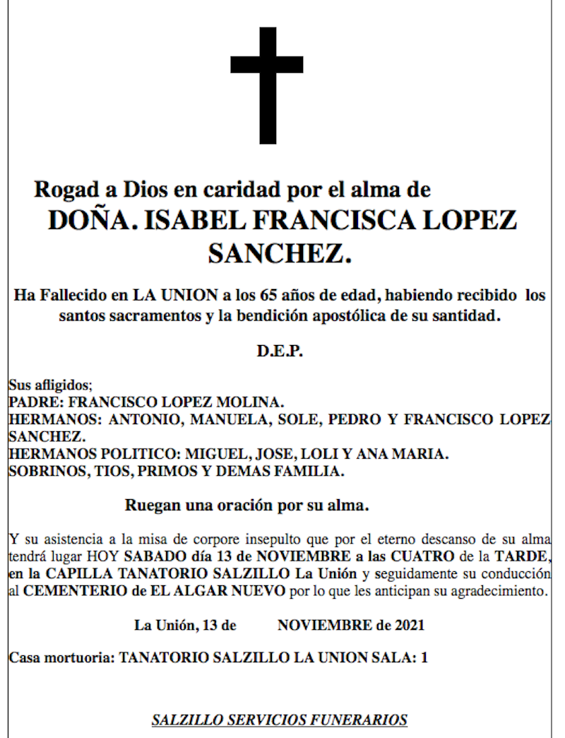 Sus afligidos Padre (Francisco López Molina), hermanos (Antonio, Manuela, Sole, Pedro y Francisco López Sánchez), hermanos políticos (Miguel, José, Loli y Ana María), sobrinos, tíos, primos y demás familia ruegan una oración por su alma y su asistencia a la misa de corpore insepulto que por el eterno descanso de su alma tendrá lugar este sábado, 13 de noviembre, a las cuatro de la tarde en la capilla del Tanatorio Salzillo de La Unión y, seguidamente, su conducción al CEMENTERIO de EL ALGAR NUEVO por lo que les anticipan su agradecimiento.