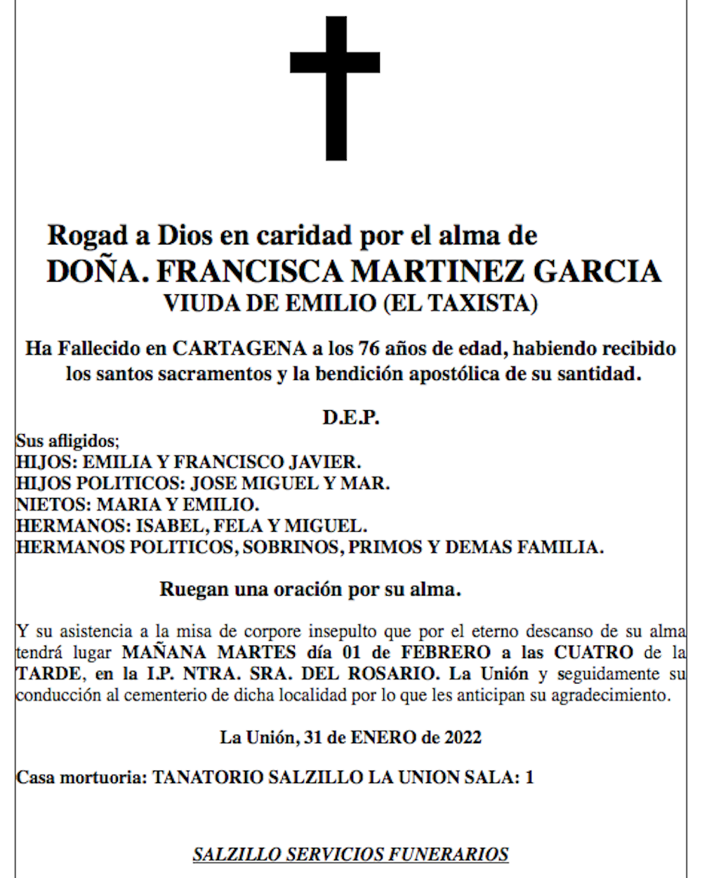 Sus afligidos hijos (Emilia y Francisco Javier), hijos políticos (José Miguel y Mar), nietos (María y Emilio), hermanos (Isabel, Fela y Miguel), hermanos políticos, sobrinos, primos y demás familia ruegan una oración por su alma y su asistencia a la misa de ‘corpore insepulto’ que por el eterno descanso de su alma tendrá lugar este martes, día uno de febrero, a las cuatro de la tarde, en la iglesia parroquia de Nuestra Señora del Rosario de La Unión y, seguidamente, su conducción al cementerio de dicha localidad por lo que les anticipan su agradecimiento.