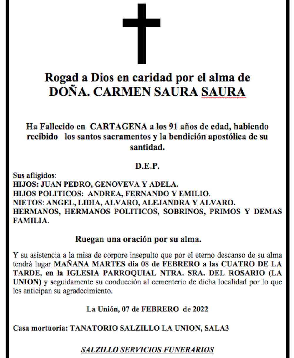 Sus afligidos hijos (Juan Pedro, Genoveva y Adela), hijos políticos (Andrea, Fernando y Emilio), nietos (Ángel, Lidia, Álvaro, Alejandra y Álvaro), hermanos, hermanos políticos, sobrinos, primos y demás familia ruegan una oración por su alma y su asistencia a la misa de 'corpore insepulto' que por el eterno descanso de su alma tendrá lugar este martes, 8 de febrero, a las cuatro de la tarde, en la iglesia parroquial de Nuestra Señora del Rosari (La Unión) y seguidamente su conducción al cementerio de dicha localidad por lo que les anticipan su agradecimiento.