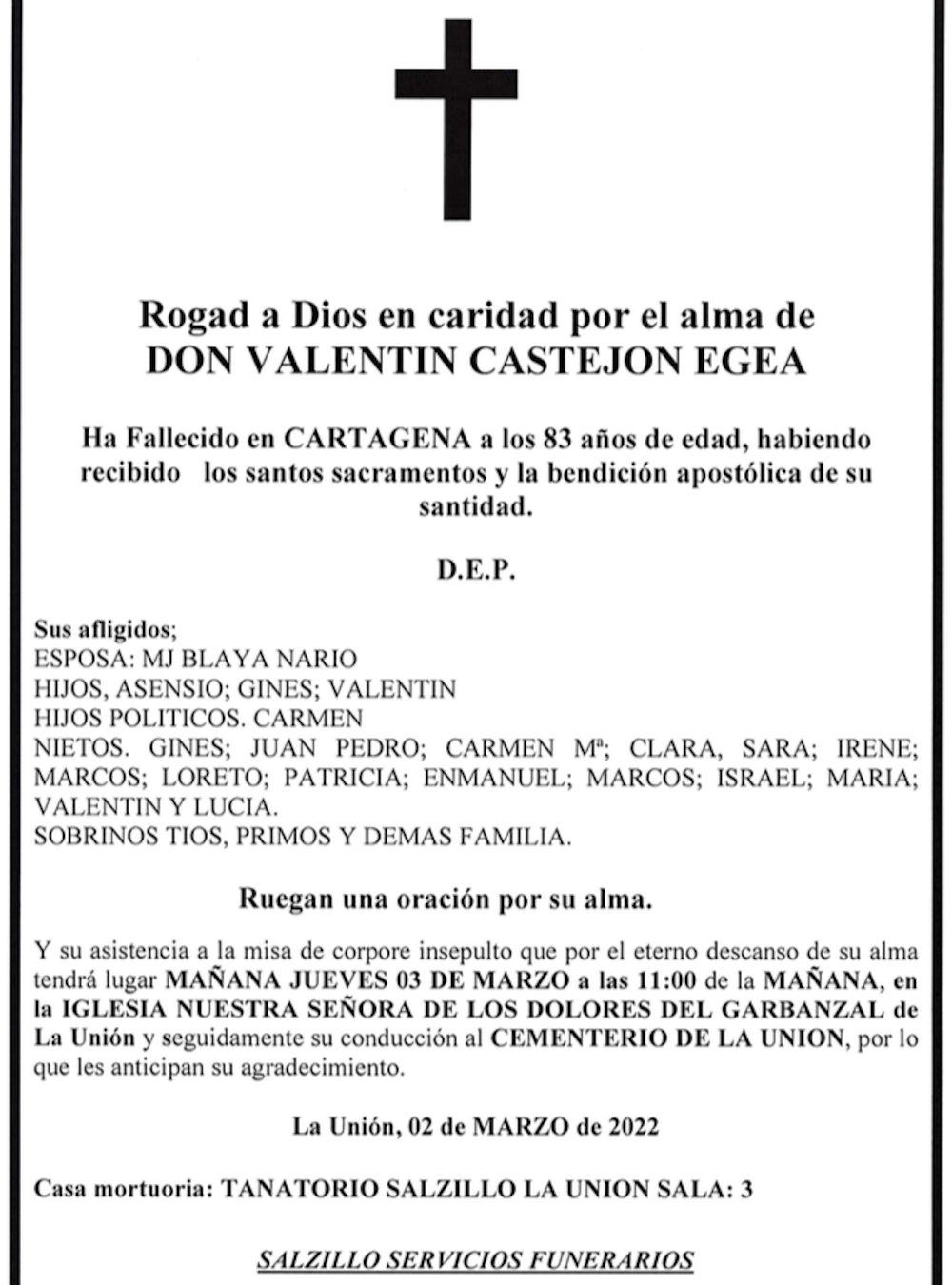 Sus afligidos esposa (MJ Blaya Nario), hijos (Asensio, Ginés y Valentín), hijos políticos (Carmen), nietos (Ginés, Juan Pedro, Carmen MU, Clara, Sara, Irene, Marcos, Loreto, Paticia, Enmanuel, Marcos, Israel, María, Valentín y Lucía), sobrinos, tíos y demás fammilia ruegan una oración por su alma y su asistencia a la misa de corpore insepulto que por el eterno descanso de su alma tendrá lugar este jueves, 3 de marzo, a las 11 horas de la mañana, en la iglesia de Nuestra Señora de los Dolores de El Garbanzal de La Unión y, seguidamente, su conducción al cementerio de La Unión, por lo que les anticipan su agradecimiento.