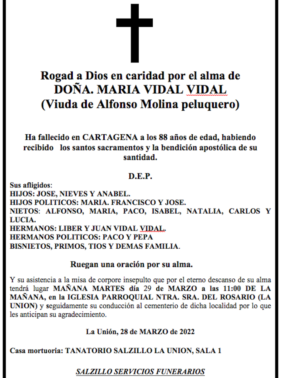 Sus afligidos hijos (José, Nieves y Anabel), hijos políticos (María, Francisco y José), nietos (Alfonso, María, Paco, Isabel, Natalia, Carlos y Lucía), hermanos (Liber y Juan Vidal Vidal), hermanos políticos (Paco y Pepa), bisnietos, primos, tíos y demás familia ruegan una oración por su alma y su asistencia a la misa de corpore insepulto que por el eterno descanso de su alma tendrá lugar este martes, día 29 de marzo, a las 11:00 de la mañana en la iglesia parroquial de Nuestra Señora del Rosario de la Unión y seguidamente su conducción al cementerio de dicha localidad por lo que les anticipan su agradecimiento.