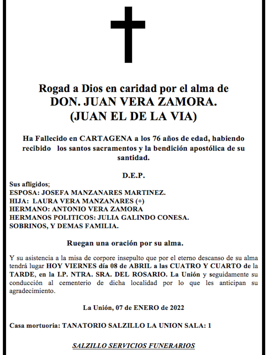 Sus afligidos esposa (Josefa Manzanares Martínez), hija (Laura Vera Manzanares+), hermano (Antonio), hermano político (Julia Galindo Conesa), sobrinos y demás familia ruegan una oración por su alma y su asistencia a la misa de corpore insepulto que por el eterno descanso de su alma tendrá lugar este viernes, día 8 de abril, a las 16.15 horas, en la iglesia parroquial de Nuestra Señora del Rosario de La Unión y seguidamente su conducción al cementerio de dicha localidad, por lo que les anticipan su agradecimiento.