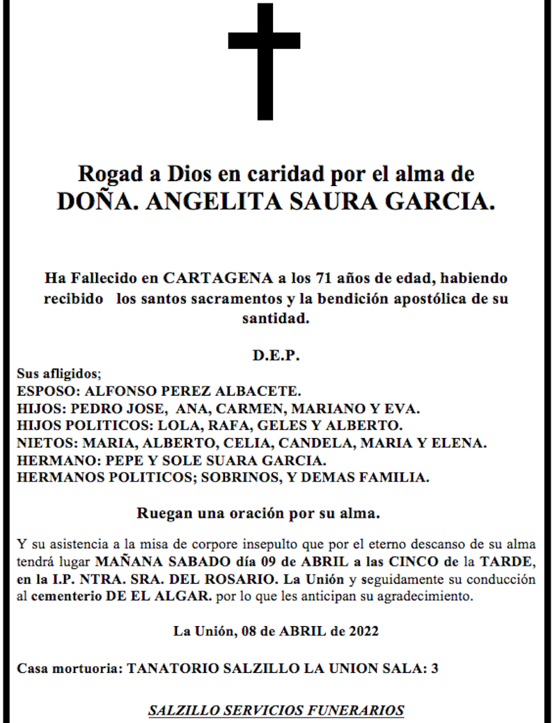 Sus afligidos esposo (Alfonso Pérez Albacete), hijos (Pedro José, Ana, Carmen, Mariano y Eva), hijos políticos (Lola, Rafa, Geles y Alberto), nietos (María, Alberto, Celia, Candela, María y Elena), hermanos (Pepe y Sole), hermanos políticos, sobrinos y demás familia ruegan una oración por su alma y su asistencia a la misa de corpore insepulto que por el eterno descanso de su alma tendrá lugar este sábado, día 9 de abril, a las cinco de la tarde, en la iglesia parroquial de Nuestra Señora del Rosario de La Unión y, seguidamente, su conducción al cementerio de El Algar, por lo que les anticipan su agradecimiento.