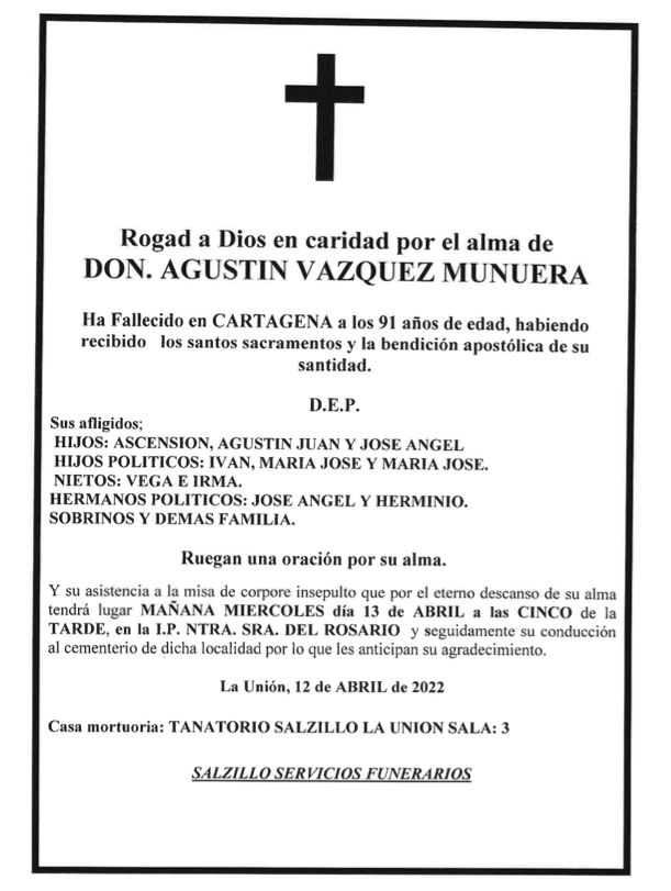 Sus afligidos hijos (Ascensión, Agustín Juan y José Ángel), hijos políticos (Iván, María José y María José), nietos (Vega e Irma), hermanos políticos (José Ángel y Herminio), sobrinos y demás familia ruegan una oración por su alma y su asistencia a la misa de corpore insepulto que por el etemo descanso de su alma tendrá lugar este miércoles, día 13 de abril, a las cinco de la tarde, en la iglesia de Nuestra Señora del Rosario, y seguidamente su conducción al cementerio de dicha localidad, por lo que les anticipan su agradecimiento.
