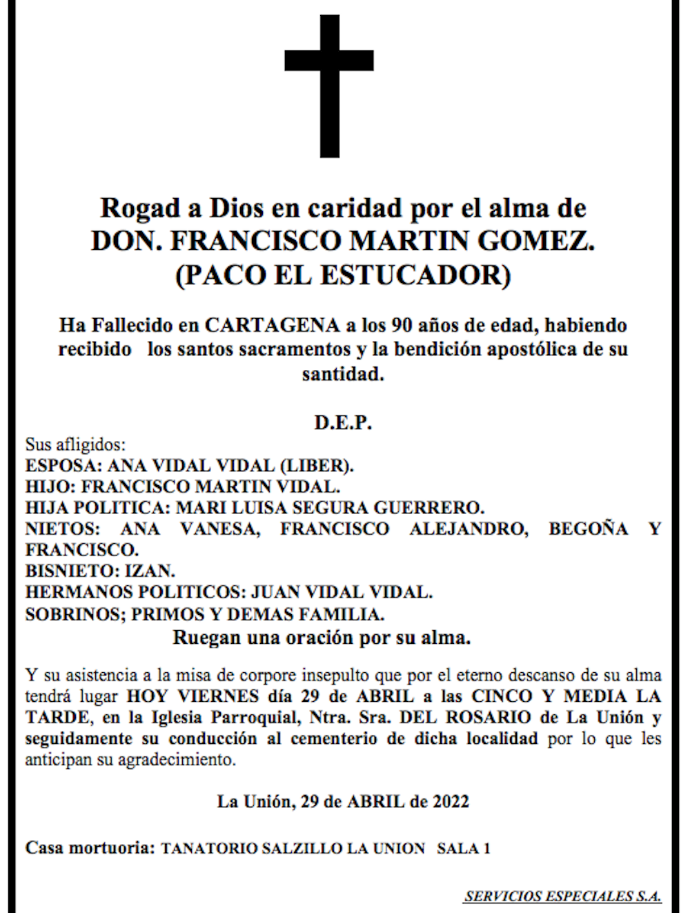 Sus afligidos esposa Ana Vidal Vidal (liber), hijo (Francisco), hija política (Mari Luisa Segura Guerrero), nietos (Ana Vanesa, Francisco Alejandro, Begoña y Francisco), bisnieto (Izan), hermanos políticos (Juan Vidal Vidal), sobrinos, primos y demás familia ruegan una oración por su alma y su asistencia a la misa de corpore insepulto que por el eterno descanso de su alma tendrá lugar hoy, viernes 29 de abril, a las cinco y media de la tarde, en la iglesia parroquial de Nuestra Señora del Rosario de La Unión y, seguidamente, su conducción al cementerio de dicha localidad por lo que les anticipan su agradecimiento.