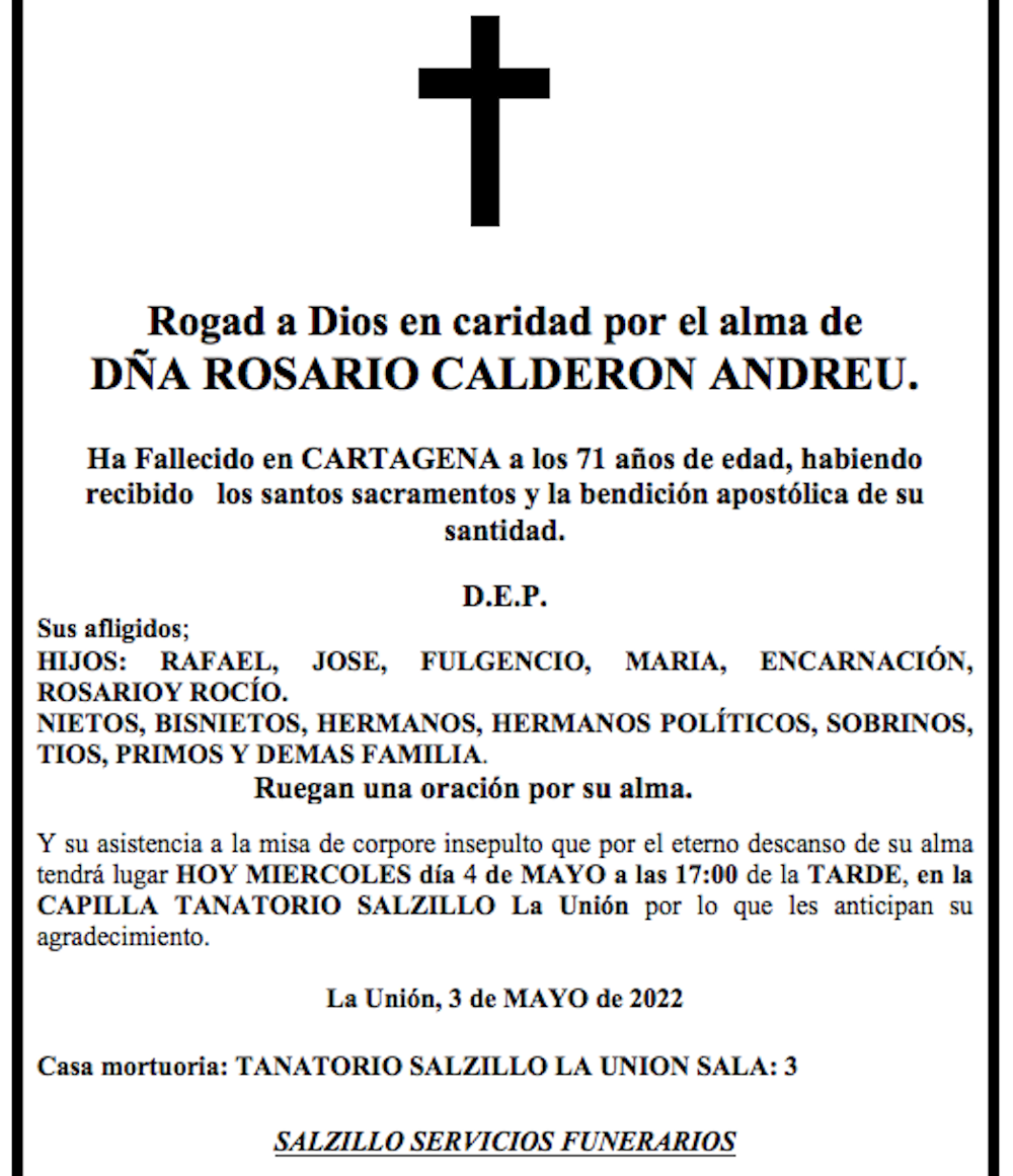 Sus afligidos hijos (Rafael, José, Fulgencio, María, Encarnación, Rosario y Rocío), nietos, bisnietos, hermanos, hermanos políticos, sobrinos, tíos, primos y demás familia ruegan una oración por su alma y su asistencia a la misa de corpore insepulto que por el eterno descanso de su alma tendrá lugar hoy, miércoles 4 de mayo, a las 17 horas de la tarde, en la capilla del Tanatorio Salzillo de La Unión, por lo que les anticipan su agradecimiento.