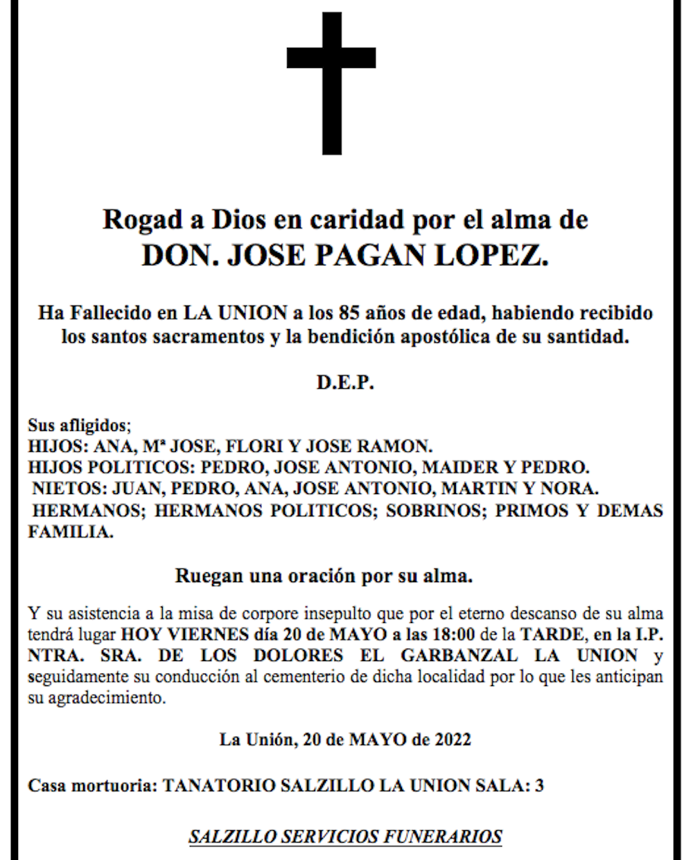 Sus afligidos hijos (Ana, María José, Flori y José Ramón), hijos políticos (Pedro, José Antonio, Maider y Pedro), nietos (Juan, Pedro, Ana, José Antonio, Martín y Nora), hermanos, hermanos políticos, sobrinos, primos y demás familia ruegan una oración por su alma y su asistencia a la misa de corpore insepulto que por el eterno descanso de su alma tendrá lugar hoy, viernes 20 de mayo, a las 18 horas de la tarde en la iglesia parroquia de Nuestra Señora de los Dolores de El Garbanzal (La Unión), y seguidamente su conducción al cementerio de dicha localidad, por lo que les anticipan su agradecimiento.