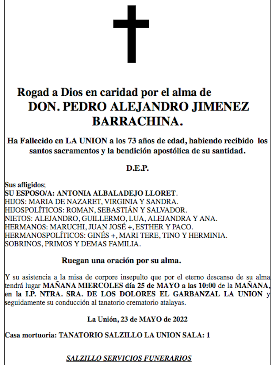 Sus afligidos esposa (Antonia Albaladejo Lloret), hijos (María de Nazaret, Virginia y Sandra), hijos políticos (Román, Sebastián y Salvador), nietos (Alejandro, Guillermo, Lua, Alejandra y Ana), hermanos (Maruchi, Juan José+, Esther y Paco), hermanos políticos (Ginés+, Mari Tere, Tino y Herminia), sobrinos, primos y demás familia ruegan una oración por su alma y su asistencia a la misa de corpore insepulto que por el eterno descanso de su alma tendrá lugar este miércoles, 25 de mayo, a las 10 horas, en la iglesia parroquial de Nuestra Señora de los Dolores de El Garbanzal, en La Unión y seguidamente su conducción al tanatorio crematorio Atalayas.