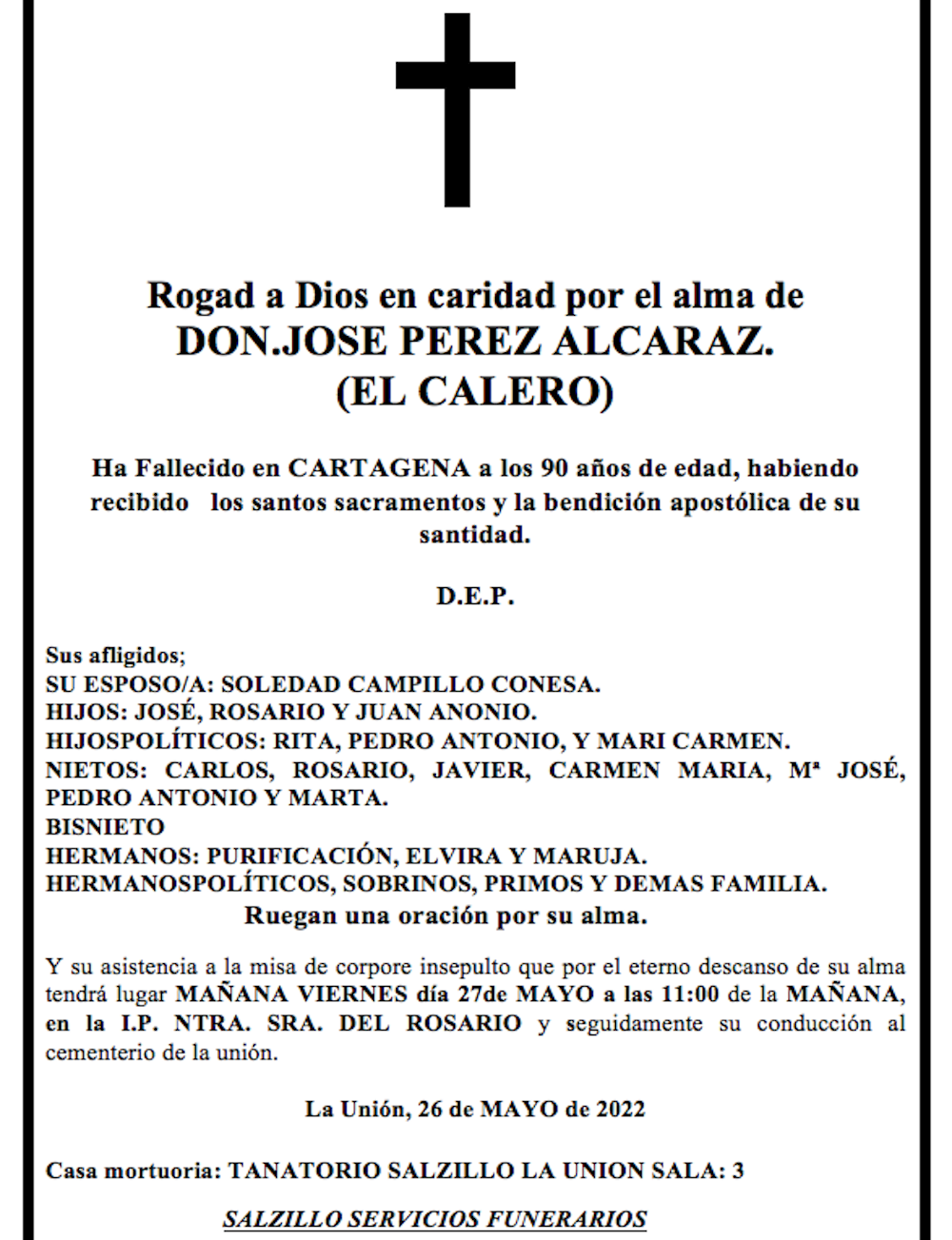 Sus afligidos esposa (Soledad Campillo Conesa), hijos (José, Rosario y Juan Antonio), hijos políticos (Rita, Pedro Antonio y Maricarmen), nietos (Carlos, Rosario, Javier, Carmen María, María José, Pedro Antonio y Marta), bisnieto, hermanos (Purificación, Elvira y Maruja), hermanos políticos, sobrinos, primos y demás familia ruegan una oración por su alma y su asistencia a la misa de corpore insepulto que por el eterno descanso de su alma tendrá lugar este viernes, día 27 de mayo, a las 11 horas de la mañana, en la iglesia parroquial de Nuestra Señora del Rosario y seguidamente su conducción al cementerio de La Unión.