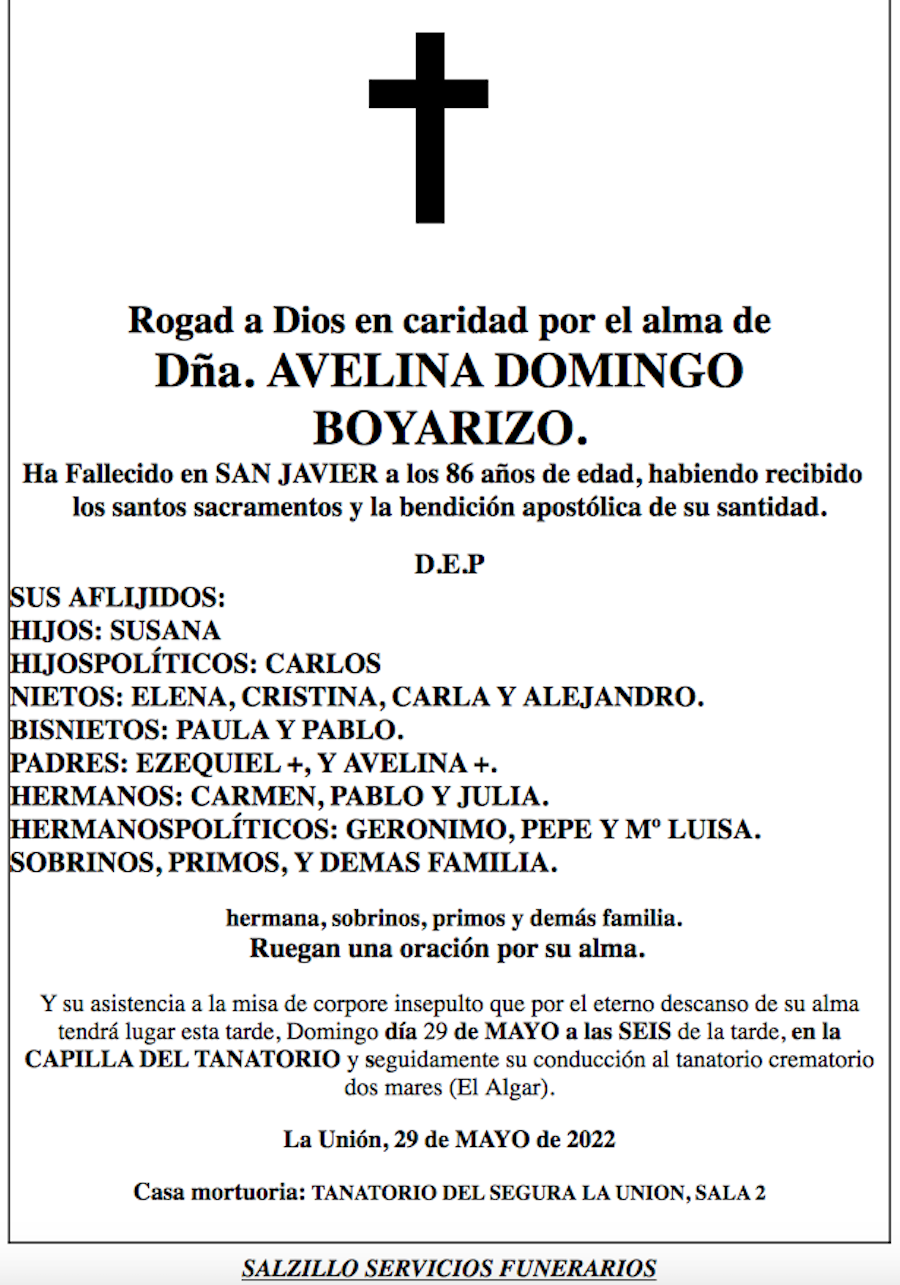 Sus afligidos hija (Susana), hijo político (Carlos), nietos (Elena, Cristina, Carla y Alejandro), bisnietos (Paula y Pablo), padres (Ezequiel+ y Avelina+), hermanos (Carmen, Pablo y Julia), hermanos políticos (Gerónimo, Pepe y María Luisa), sobrinos, primos y demás familia ruegan una oración por su alma y su asistencia a la misa de corpore insepulto que por el eterno descanso de su alma tendrá lugar esta tarde, domingo día 29 de mayo, a las 18 horas, en la capilla del Tanatorio de La Unión y seguidamente su conducción al tanatorio crematorio Dos Mares, de El Algar.