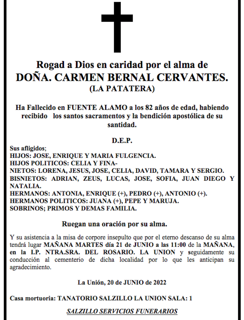 Sus afligidos hijos (José, Enrique y María Fulgencia), hijos políticos (Celia y Fina), nietos (Lorena, Jesús, José, Celia, David, Tamara y Sergio), bisnietos (Adrián, Zeus, Lucas, José, Sofía, Juan Diego y Natalia), hermanos (Antonia, Enrique+, Pedro+ y Antonio+), hermanos políticos (Juana+, Pepe y Maruja), sobrinos, primos y demás familia ruegan una oración por su alma y su asistencia a la misa de corpore insepulto que por el eterno descanso de su alma tendrá lugar este martes, día 21 e junio, a las 11 horas, en la iglesia parroquial de Nuestra Señora del Rosario de La Unión y, seguidamente, su conducción al cementerio de dicha localidad por lo que les anticipan su agradecimiento.