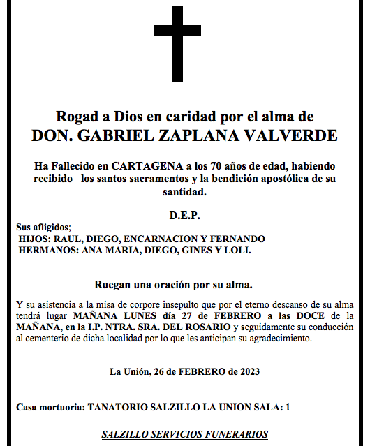 Sus afligidos hijos (Raúl, Diego, Encarnación y Fernando) y hermanos (Ana María, Diego, Ginés y Loli) ruegan una oración por su alma y su asistencia a la misa de corpore insepulto que por el eterno descanso de su alma tendrá lugar este lunes, día 27 de febrero, a las doce de la mañana en la iglesia parroquial de Nuestra Señora del Rosario y, seguidamente, su conducción al cementerio de dicha localidad, por lo que les anticipan su agradecimiento.