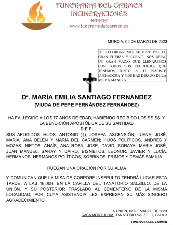 La misa de corpore insepulto tendrá lugar esta tarde, 2 de marezo, a las 16 horas en al capilla del Tanatorio Salzillo de La Unión, con posterior traslado al cementerio de la misma localidad, por cuya asistencia les expresan su más sincero agradecimiento.