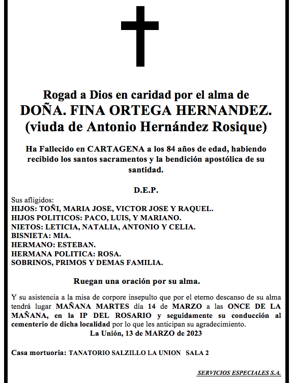 Sus afligidos hijos (Toñi, María José, Víctor José y Raquel), hijos políticos (Paco, Luis y Mariano), nietos (Leticia, Natalia, Antonio y Celia), bisnieta (Mía), hermano (Esteban), hermana política (Rosa), sobrinos, primos y demás familia ruegan una oración por su alma y su asistencia a la misa de corpore insepulto que por el eterno descanso de su alma tendrá lugar este martes, día 14 de marzo, a las once de la mañana, en la iglesia parroquial de Nuestra Señora del Rosario de La Unión, y seguidamente su conducción al cementerio de dicha localidad, por lo que les anticipan su agradecimiento.