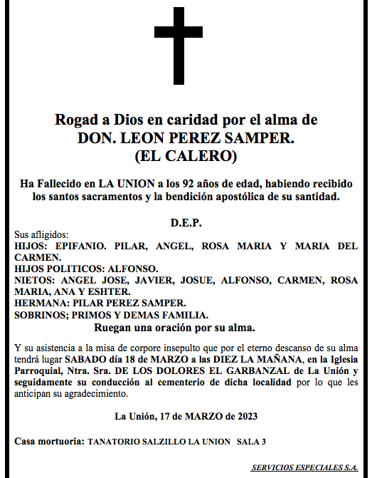 Sus afligidos hijos (Epifanio, Pilar, Ángel, Rosa María y Maria del Carmen), hijo político (Alfonso), nietos (Ángel José, Javier, Josué, Alfonso, Carmen, Rosa María, Ana y Esther), hermana (Pilar), sobrinos, primos y demás familia ruegan una oración por su alma y su asistencia a la misa de corpore insepulto que por el eterno descanso de su alma tendrá lugar este sábado, 18 de marzo, a las diez de la mañana, en la iglesia parroquial de Nuestra Señora de los Dolores de El Garbanzal, y, seguidemente, su conducción al cementerio de La Unión, por lo que les anticipan su agradecimiento.