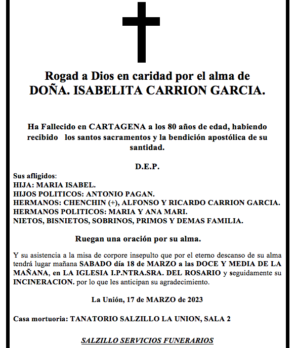 Sus afligidos hija (María Isabel), hijos políticos (Antonio Pagán), hermanos (Chenchín+, Alfonso y Ricardo), hermanos políticos (Maria y Anamari), nietos, bisnietos, sobrinos, primos y demás familia ruegan una oración por su alma y su asistencia a la misa de corpore insepulto que por el eterno descanso de su alma tendrá lugar este sábado, día 18 de marzo, a las doce y media horas del mediodía en la iglesia parroquial de Nuestra Señora del Rosario de La Unión y, seguidamente, su incineración, por lo que les anticipan su agradecimiento.