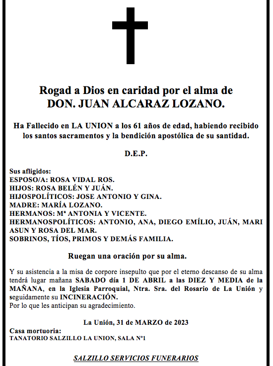 Sus afligidos esposa (Rosa Vidal Ros), hijos (Rosa Belén y Juan), hijos políticos (José Antonio y Gina), madre (María Lozano), hermanos (María Antonia y Vicente), hermanos políticos (Antonio, Ana, Diego Emilio, Juan, Mari Asun y Rosa del Mar), sobrinos, tíos, primos y demás familia ruegan una oración por su alma y su asistencia a la misa de corpore insepulto que por el eterno descanso de su alma tendrá lugar mañana este sábado, uno de abril, a las diez y media de la mañana, en la iglesia parroquial de Nuestra Señora del Rosario de La Unión y seguidamente su incineración, por lo que les anticipan su agradecimiento.