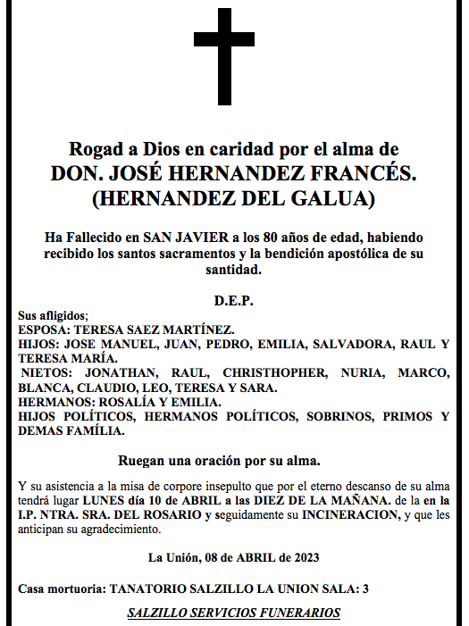 'Hernández del Galúa' ha fallecido en San Javier, a los 80 años de edad, habiendo recibido los santos sacramentos y la bendición apostólica de su santidad.