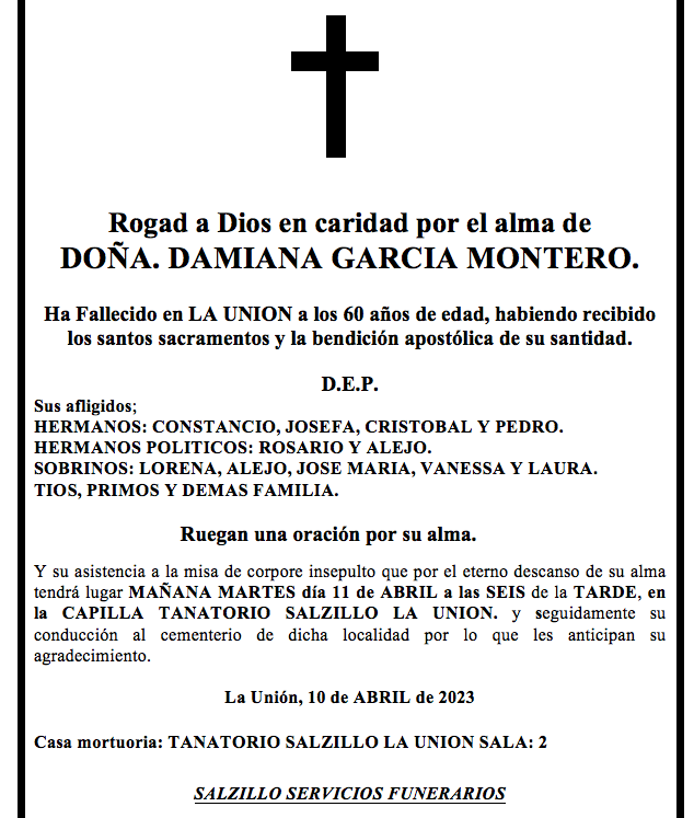 Sus afligidos hermanos (Constancio, Josefa, Cristóbal y Pedro), hermanos políticos (Rosario y Alejo), sobrinos (Lorena, Alejo, José María, Vanessa y Laura), tíos, primos y demás familia ruegan una oración por su alma y su asistencia a la misa de corpore insepulto que por el eterno descanso de su alma tendrá lugar este martes, día 11 de abril, a las seis de la tarde (18 hroas), en la capilla del Tanatorio Salzillo La Unión, y seguidamente su conducción al cementerio de dicha localidad por lo que les anticipan su agradecimiento.