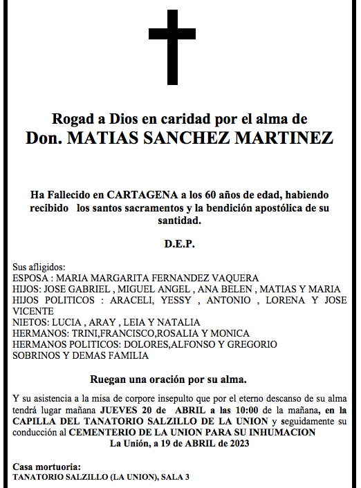 Sus afligidos esposa (María Margarita Fernández Vaquera), hijos (José Gabriel, Miguel Ángel, Ana Belén, Matías y María), hijos políticos (Araceli, Yessy, Antonio, Lorena y José Vicente), nietos (Lucía, Aray, Leia y Natalia), hermanos (Trini, Francisco, Rosalía y Mónica), hermanos políticos (Dolores, Alfonso y Gregorio), sobrinos y demás familia ruegan una oración por su alma y su asistencia a la misa de corpore insepulto que por el eterno descanso de su alma tendrá lugar este jueves (20 de abril) a las 10 horas de la mañana en la capilla del Tanatorio Salzillo de La Unión y, seguidamente, su conducción al cementerio de La Unión para su inhumación.