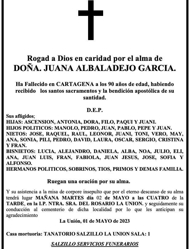 Sus afligidos hijas (Ascensión, Antonia, Dora, Filo, Paqui y Juani), hijos políticos (Manolo, Pedro, Juan, Pablo, Pepe y Juan), nietos (José, Raquel, Raúl, Leonor, Juani, Toni, Vero, May, Ana, Sonia, Pili, Pedro, David, Laura, Óscar, Sergio, Cristina y Fran), bisnietos (Lucía, Alejandro, Daniela, Alba, Noa, Julio, Eli, Ana, Juan Luis, Fran, Fabiola, Juan Jesús, José, Sofía y Alfonso), hermanos políticos, sobrinos, tíos, primos y demás familia ruegan una oración por su alma y su asistencia a la misa de corpore insepulto que por el eterno descanso de su alma tendrá lugar este martes, día 2 de mayo, a las cuatro de la tarde, en la iglesia parroquial de Nuestra Señora del Rosario de La Unión y, seguidamente, su conducción al cementerio de dicha localidad, por lo que les anticipan su agradecimiento