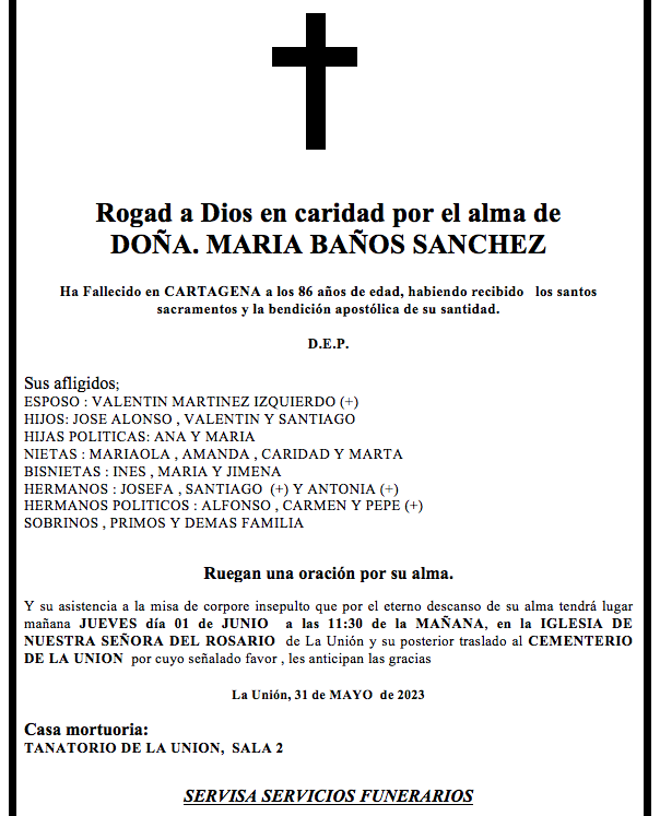 Sus afligidos esposo (Valentín Martínez Izquierdo+), hijos (José Alonso, Valentín y Santiago), hijas políticas (Ana y María), nietas (Mariola, Amanda, Caridad y Marta), bisnietas (Inés, María y Jimena), hermanos (Josefa, Santiago+ y Antonia+), hermanos políticos (Alfonso, Carmen y Pepe+), sobrinos, primos y demás familia ruegan una oración por su alma y su asistencia a la misa de corpore insepulto que por el eterno descanso de su alma tendrá lugar este jueves, uno de junio, a las 11.30 oras, en la iglesia de Nuestra Señora del Rosario de la ciudad de La Unión y su posterior traslado al cementerio de esta localidad, por cuyo señalado favor les anticipan las gracias