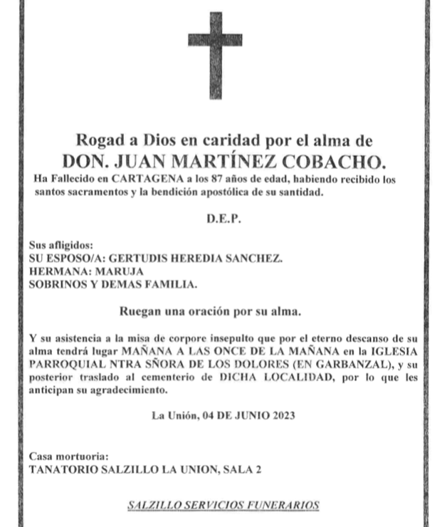 Sus afligidos esposa (Gertrudis Heredia Sánchez), hermana (Maruja), sobrinos y demás familia ruegan una oración por su alma y su asistencia a la misa de corpore insepulto que, por el eterno descanso de su alma, tendrá lugar este lunes, 5 de junio, a las 11 horas de la mañana, en la iglesia parroquial de Nuestra Señora de los Dolores, en El Garbanzal, y su posterior traslado al cementerio de La Unión, por lo que les anticipan su agradecimiento.