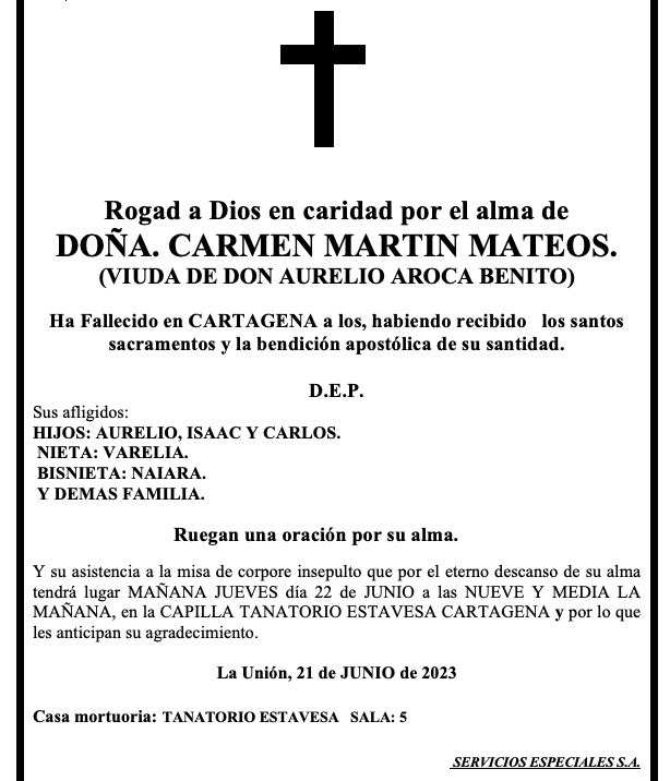 Sus afligidos hijos (Aurelio, Isaac y Carlos), nieta (Valeria), bisnieta (Naiara) y demás familia ruegan una oración por su alma y su asistencia a la misa de corpore insepulto que por el eterno descanso de su alma tendrá lugar este jueves, día 22 de junio, a las 9.30 horas de la mañana, en la capilla del Tanatorio Estavesa de Cartagena, por lo que les anticipan su agradecimiento.