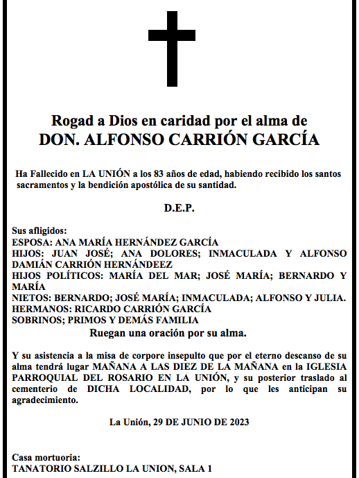 Sus afligidos esposa (Ana María Hernández García), hijos (Juan José, Ana Dolores, Inmaculada y Alfonso), hijos políticos (María del Mar, José María, Bernardo y María), nietos (Bernardo, José María, Inmaculada, Alfonso y Julia), hermano (Ricardo), sobrios primos y demás familia ruegan una oración por su alma y su asistencia a la misa de corpore insepulto que por el eterno descanso de su alma tendrá lugar este viernes, a las diez de la mañana, en la iglesia parroquial de Nuestra Señora del Rosario de La Unión, y su posterior traslado al cementerio de dicha localidad, por lo que les anticipan su agradecimiento.