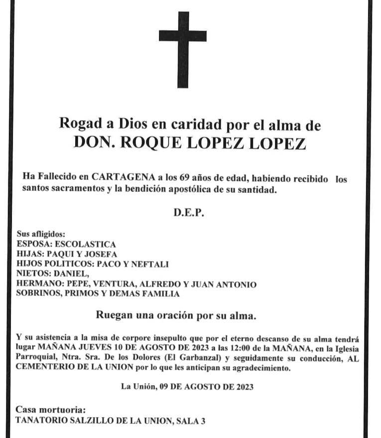 Sus afligidos esposa (Escolástica), hijas (Paqui y Josefa), hijos políticos (Paco y Neftali), nietos (Daniel), hermanos (Pepe, Ventura, Alfredo y Juan Antonio), sobrinos, primos y demás familia ruegan una oración por su alma y su asistencia a la misa de 'corpore insepulto' que por el eterno descanso de su alma tendrá lugar este jueves, 10 de agosto de 2023, a las 12 de la mañana, en la iglesia parroquial de Nuestra Señora de los Dolores (El Garbanzal) y, seguidamente, su conducción al cementerio de La Unión, por lo que les anticipan su agradecimiento.