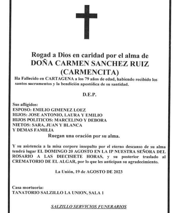 Sus afligidos esposo (Emilio Giménez Loez), hijos (José Antonio, Laura y Emilio), hijos políticos (Marcelino y Débora), nietos (Sara, Juan y Blanca) y demás familia ruegan una oración por su alma y su asistencia a la misa corpore insepulto por el eterno descanso de su alma tendrá lugar este domingo, 20 de agosto, a las diecisiete horas, en la iglesia parroquial de Nuestra Señora del Rosario de La Unión, con posterior traslado al tanatorio-crematorio de El Algar, por lo que les anticipan su agradecimiento.