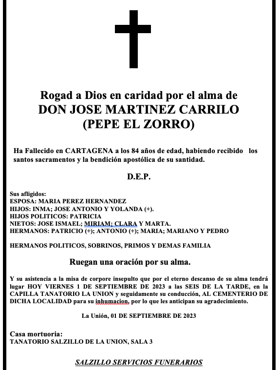 Sus afligidos esposa (María Pérez Hernández), hijos (Inma, José Antonio y Yolanda+), hijos políticos (Patricia), nietos (José Ismael, Miriam, Clara y Marta), hermanos (Patricio+, Antonio+, María, Mariano y Pedro), hermanos políticos, sobrinos, primos y demás familia ruegan una oración por su alma y su asistencia a la misa de corpore insepulto que por el eterno descanso de su alma tendrá lugar hoy, viernes, 1 de septiembre de 2023, a las seis de la tarde, en la capilla del Tanatorio La Unión y, seguidamente, su conducción al cementerio de dicha localidad para su inhumación, por lo que les anticipan su agradecimiento.