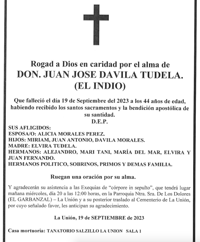 Sus afligidos esposa (Alicia Morales Pérez), hijos (Miriam y Juan Antonio), madre (Elvira Tudela), hermanos (Alejandro, Mari Tani, María del Mar, Elvira y Juan Fernando), hermanos políticos, sobrinos, primos y demás familia ruegan una oración por su alma y agradecerán su asistencia a las exequias de 'corpore in sepulto', que tendrá lugar este miércoles, día 20 a las 12 horas, en la parroquia de Nuestra Señora de los Dolores, de El Garbanzal-La Unión, y a su posterior traslado al cementerio de La Unión, por cuyo señalado favor les anticipan su agradecimiento.