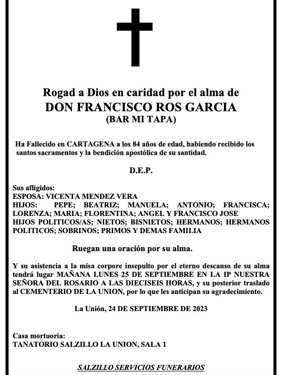 Sus afligidos esposa (Vicenta Méndez Vera), hijos (Pepe, Beatriz, Manuela, Antonio, Francisca, Lorenza, María, Florentina, Ángel y Francisco José), hijos políticos, nietos, bisnietos, hermanos, hermanos políticos, sobrinos, primos y demás familia ruuegan una oración por su alma y su asistencia a la misa corpore insepulto por el eterno descanso de su alma tendrá lugar este lunes, 25 de septiembre, a las 16 horas, en la iglesia parroquial de Nuestra Señora del Rosario, y su posterior traslado al cementerio de La Unión, por lo que les anticipan su agradecimiento.