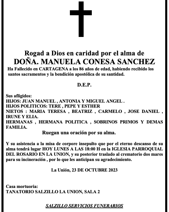 Sus afligidos hijos (Juan Manuel, Antonia y Miguel Ángel), hijos políticos (Tere, Pepe y Esther), nietos (María Teresa, Beatriz, Carmelo, José Daniel, Irune y Elía), hermanas, hermana política, sobrinos, primos y demás familia ruegan una oración por su alma y su asistencia a la misa de corpore insepulto que por el eterno descanso de su alma tendrá lugar hoy, lunes, a las 18 horas, en la iglesia parroquial del Roasrio en La Unión, y su posterior traslado al crematorio Dos Mares para su incineración, por lo que les anticipan su agradecimiento.