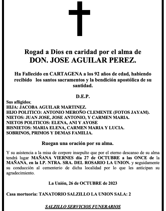 Sus afligidos hija (Jacoba Aguilar Martínez), hijo político (Antonio Meroño Clemente - Fotos Jayam), nietos (Juan José, José Antonio y Carmen María), nietos políticos (Elena, Ani y Ayose), bisnietos (María Elena, Carmen María y Lucía), sobrinos, primos y demás familia ruegan una oración por su alma y su asistencia a la misa de corpore insepulto que por el eterno descanso de su alma tendrá lugar este viernes, día 27 de octubre, a las once de la mañana en la iglesia parroquial de Nuestra Señora del Rosario de La Unión, y seguidamente su conducción al cementerio de dicha localidad por lo que les anticipan su agradecimiento.