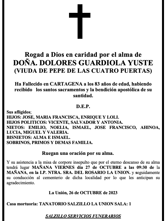Sus afligidos hijos (José, María Francisca, Enrique y Loli), hijos políticos (Vicente, Salvador y Antonia), nietos (Emilio, Noelia, Ismael, José Francisco, Ainhoa, Lucía, Miguel y Valeria), bisnietos (Alma e Ismael), sobrino, primos y demás familia ruegan una oración por su alma y su asistencia a la misa de corpore insepulto que por el eterno descanso de su alma tendrá lugar este viernes, día 27 de octubre, a las 9.30 horas de la mañana, en la iglesia parroquial de Nuestra Señora del Rosario de La Unión, y seguidamente su conducción al cementerio de dicha localidad por lo que les anticipan su agradecimiento.