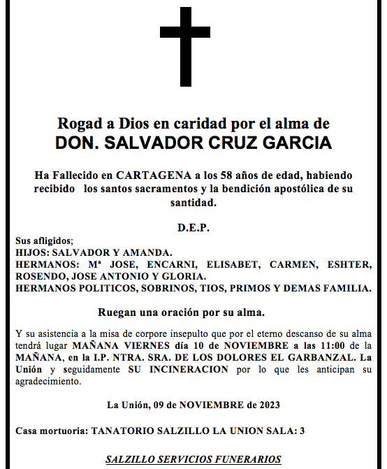 Sus afligidos hijos (Salvador y Amanda), hermanos (María José, Encarni, Elisabet, Carmen, Esther, Rosendo, José Antonio y Gloria), hermanos políticos, sobrinos, tíos, primos y demás familia ruegan una oración por su alma y su asistencia a la misa de corpore insepulto que por el eterno descanso de su alma tendrá lugar este viernes, día 10 de noviembre, a las once de la mañana, en la iglesia parroquial de Nuestra Señora de los Dolores de El Garbanzal (La Unión) y seguidamente su incineración, por lo que les anticipan su agradecimiento.