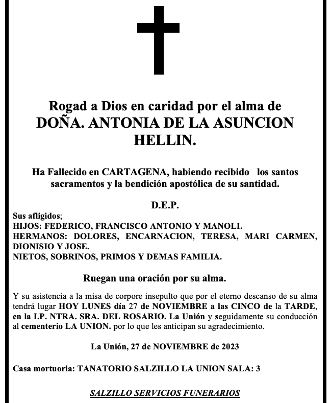 Sus afligidos hijos (Federico, Francisco Antonio y Manoli), hermanos (Dolores, Encarnación, Teresa, Mari Carmen, Dionisio y José), nietos, sobrinos, primos y demás familia ruegan una oración por su alma y su asistencia a la misa de corpore insepulto que por el eterno descanso de su alma tendrá lugar hoy, lunes 27 de noviembre, a las 17 horas, en la iglesia parroquial de Nuestra Señora del Rosario de La Unión y, seguidamente, a su conducción al cementerio de la misma localidad, por lo que les anticipan su agradecimiento.