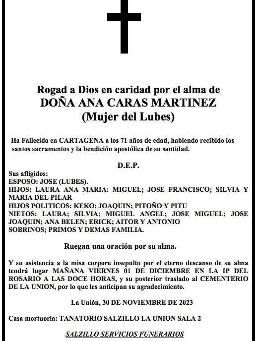 Sus afligidos hijos (Laura Ana María, Miguel, José Francisco, Silvia y María del Pilar), hijos políticos (Keko, Joaquín, Pitoño y Pitu), nietos (Laura, Silvia, Miguel Ángel, José Miguel, José Joaquín, Ana Belén, Erick, Aitor y Antonio), sobrinos, primos y demás familia ruegan una oración por su alma y su asistencia a la misa corpore insepulto por el eterno descanso de su alma tendrá lugar este viernes, uno de diciembre, en la iglesia parroquial de Nuestra Señora del Rosario de La Unión y su posterior traslado al cementerio de dicha localidad, por lo que les anticipan su agradecimiento.