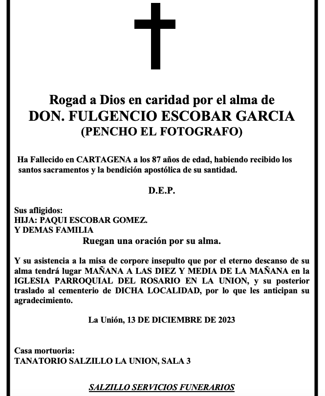 Su afligida hija, Paqui Escobar Gómez, y demás familia ruegan una oración por su alma y su asistencia a la misa de corpore insepulto que por el eterno descanso de su alma tendrá lugar este jueves, a las diez y media de la mañana, en la iglesia parroquial de Nuestra Señora del Rosario de La Unión y su posterior traslado al cementerio de la misma localidad, por lo que les anticipan su agradecimiento.