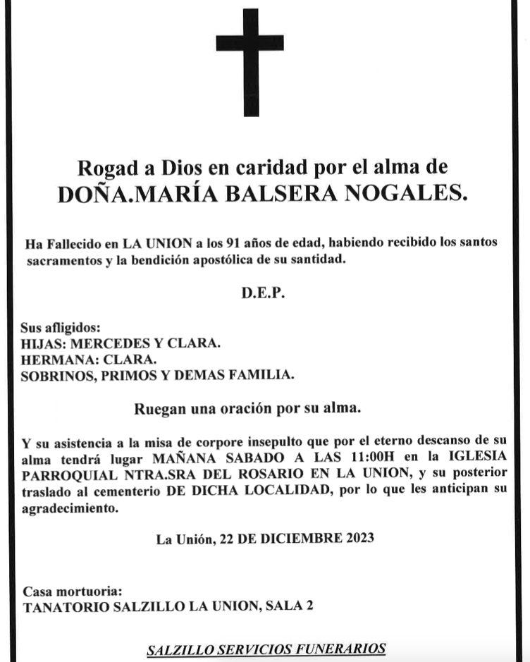 Sus afligidas hijas (Mercedes y Clara), hermana (Claera), sobrinos, primos y demás familia ruegan una oración por su alma y su asistencia a la misa de corpore insepulto que por el eterno descanso de su alma tendrá lugar este sábado, a las 11 horas, en la iglesia parroquial de Nuestra Señora del Rosario de La Unión, y su posterior traslado al cementerio de dicha localidad, por lo que les anticipan su